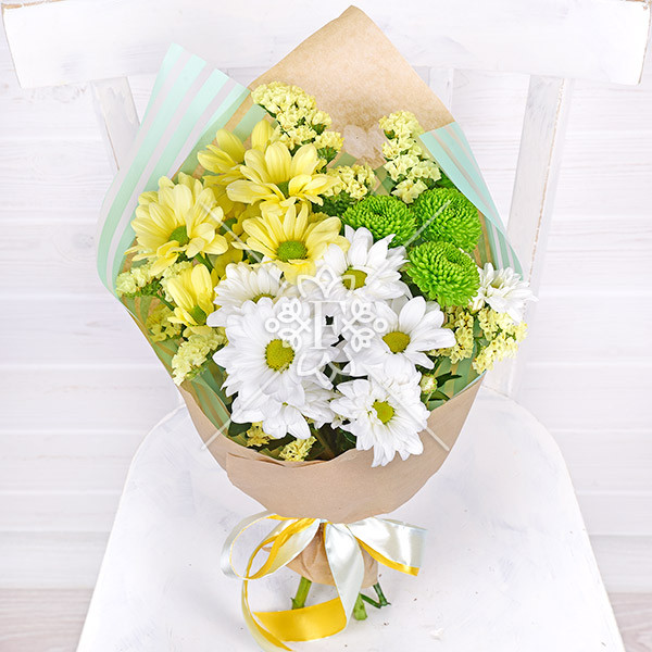 Хризантема кустовая желтая – 1 шт., хризантема кустовая белая – 1шт., хризантема кустовая зеленая – 1 шт., статица – 1 шт., упаковка, лента.