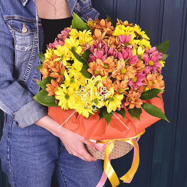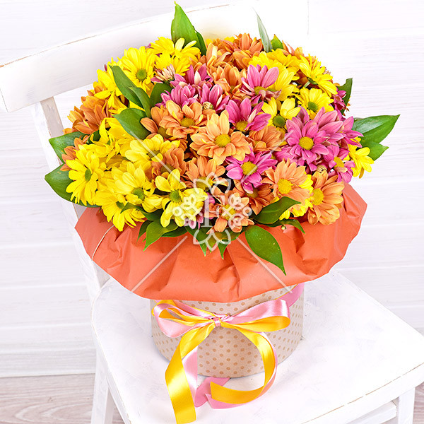 Кустовые ромашковидные хризантемы насыщенно-желтого,  нежно-розового и оранжевого оттенков с зеленью рускуса, выглядят обворожительно!