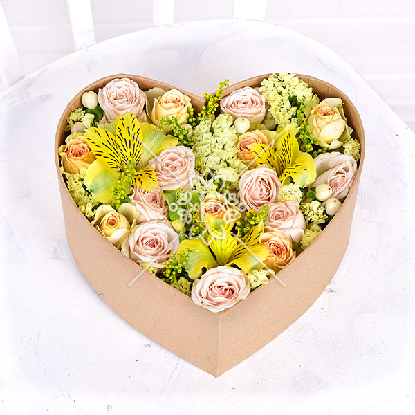роза кремовая кустовая – 2 шт., роза желтая кустовая – 2 шт., альстромерия желтая - 1 шт., гиперикум белый – 1 шт., статица жёлтая – 1 шт., зелень декоративная (солидаго), оазис, коробка.