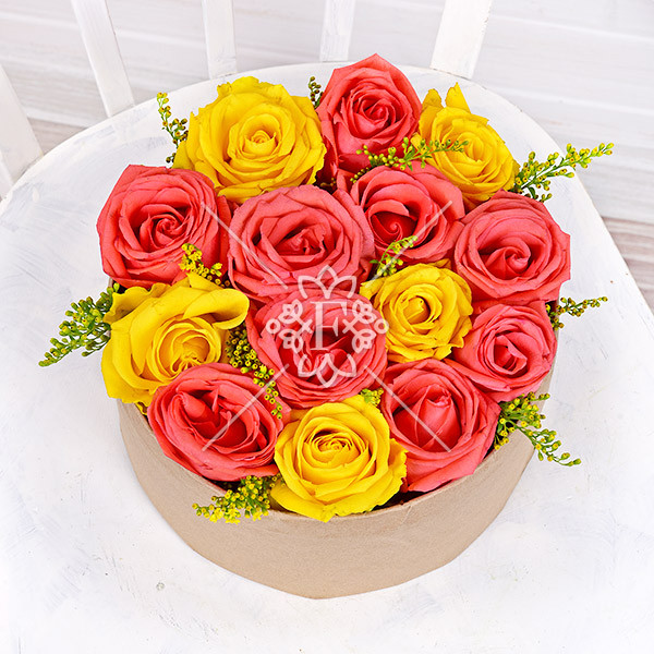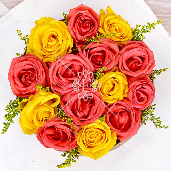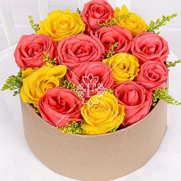 роза желтая – 5 шт., роза оранжевая – 10 шт., зелень декоративная (солидаго), оазис, коробка.